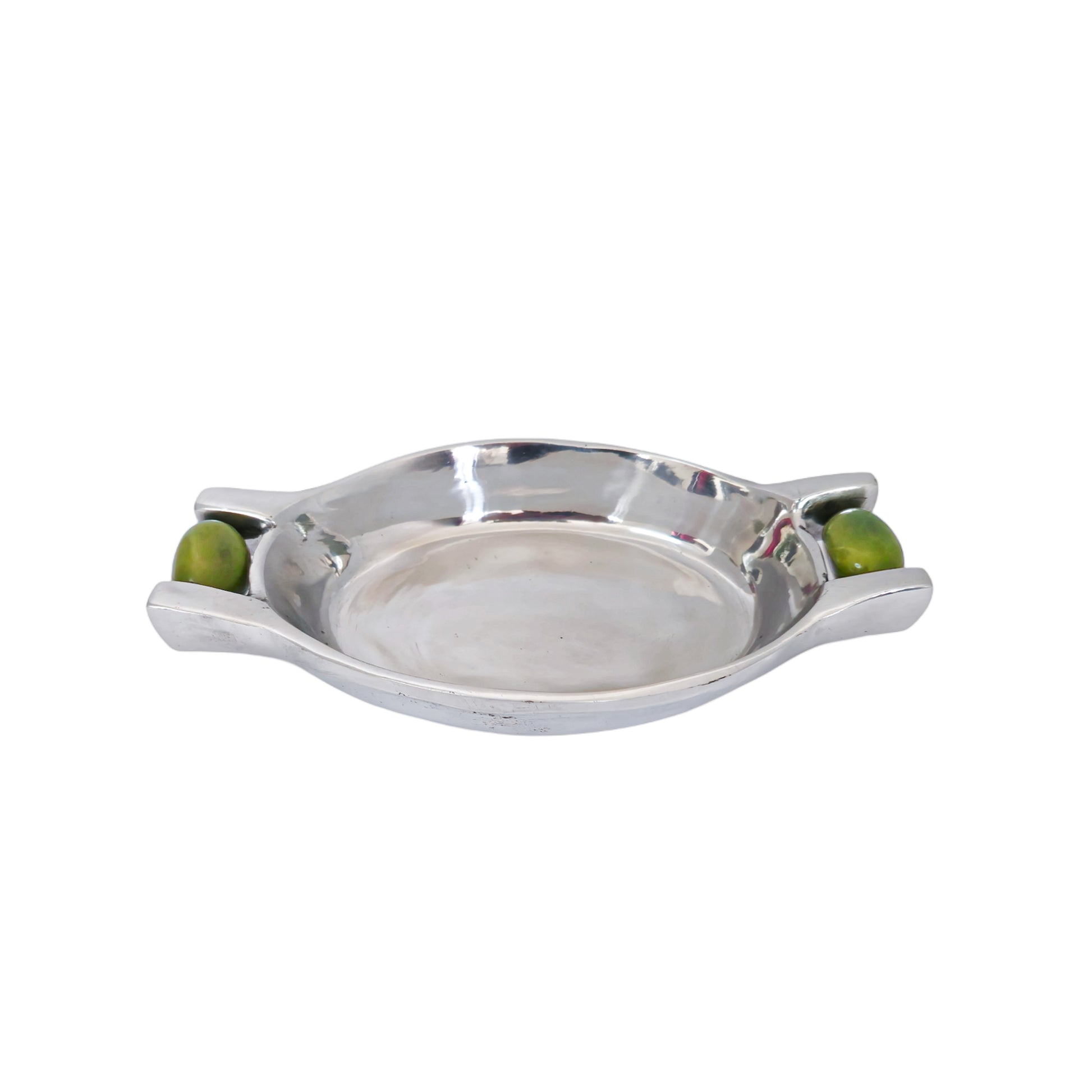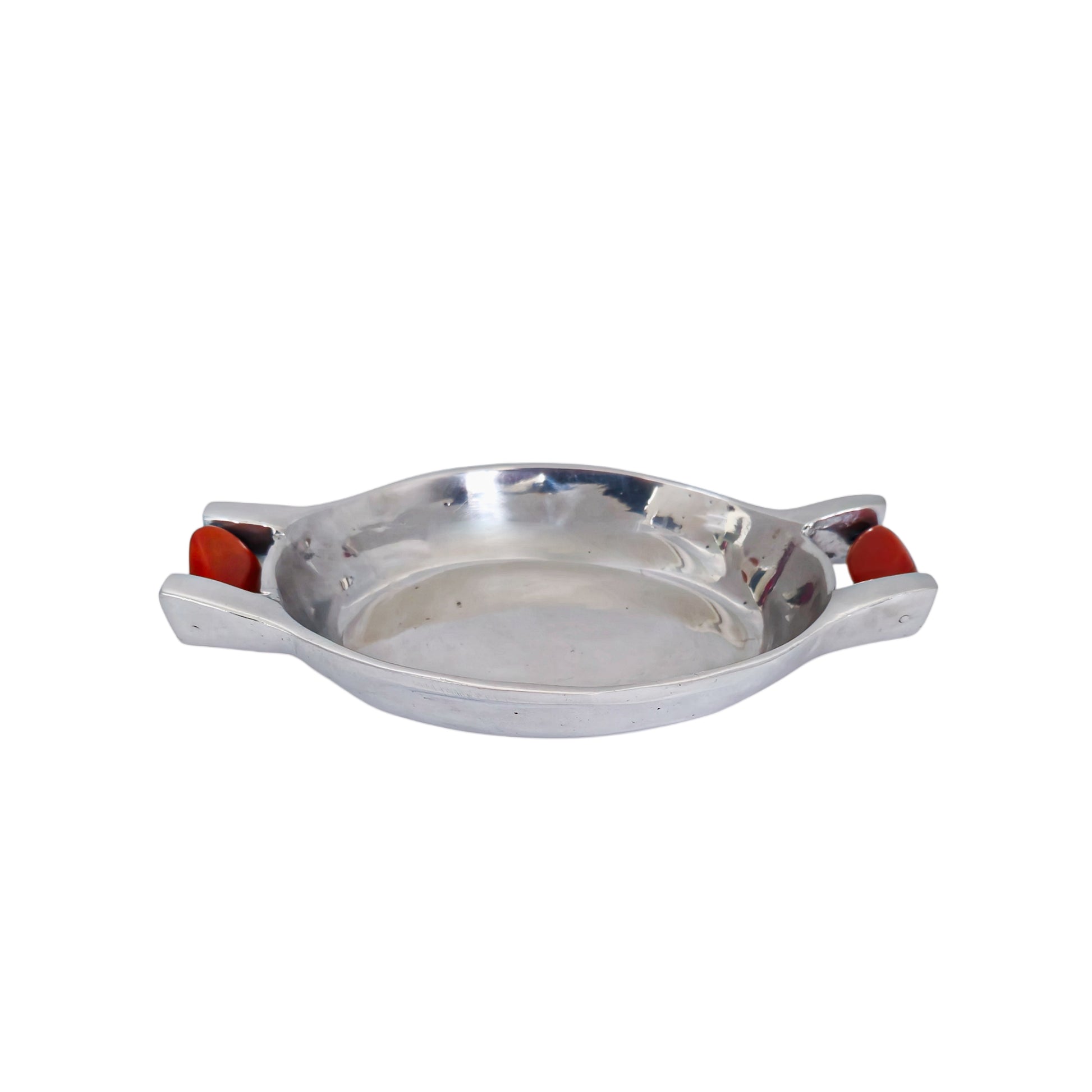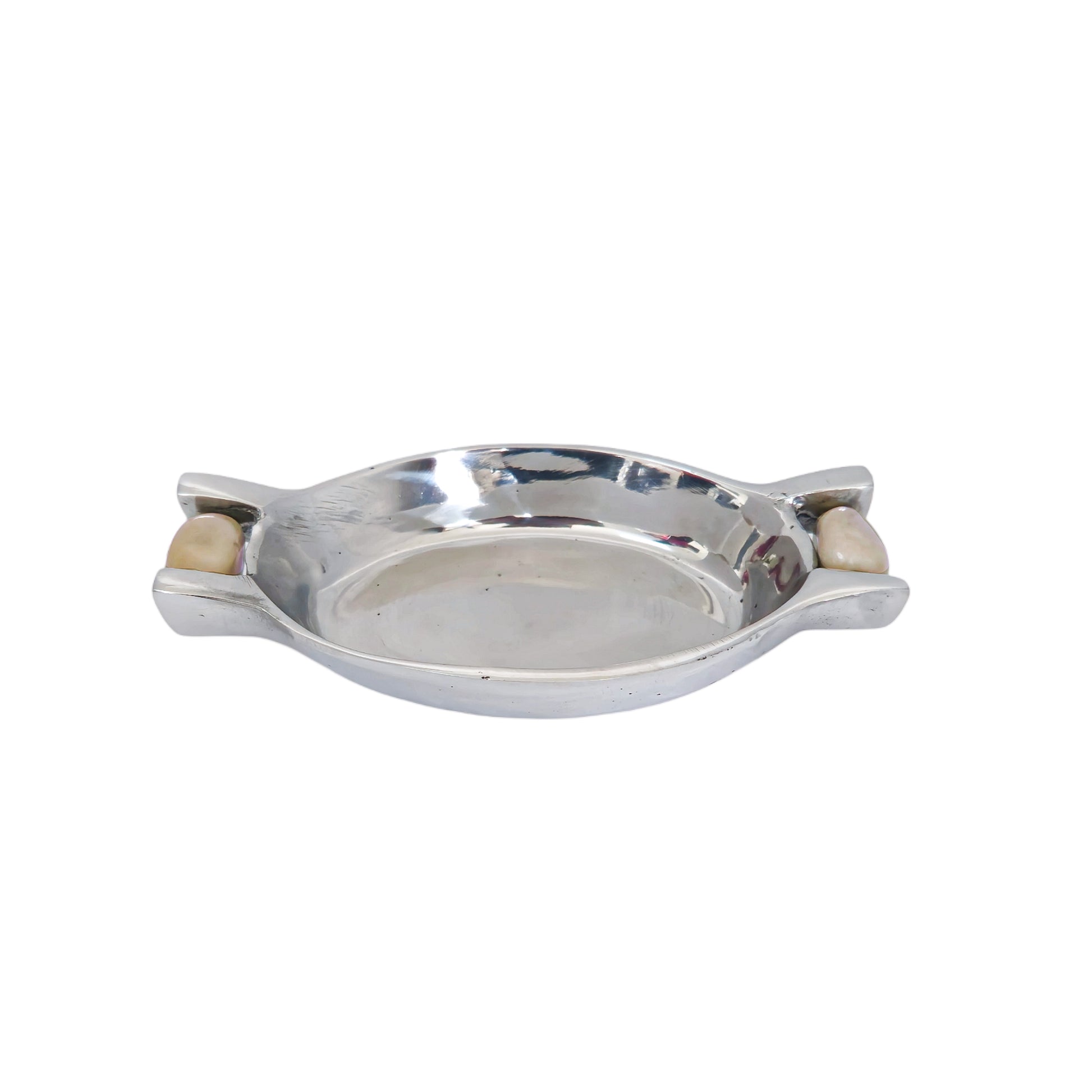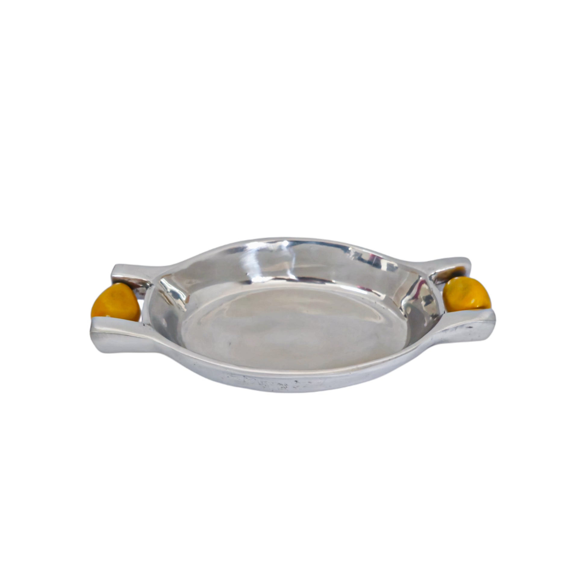 This stunning handcrafted pewter serving tray is the perfect blend of elegance and sustainability. Featuring a polished silver-like finish, the tray is adorned with vibrant tagua seed handles, sustainably sourced from Ecuador. The tagua accents, resembling ivory, are available in four rich colors: orange, yellow, ivory, and green, adding a unique and artistic touch to the design.